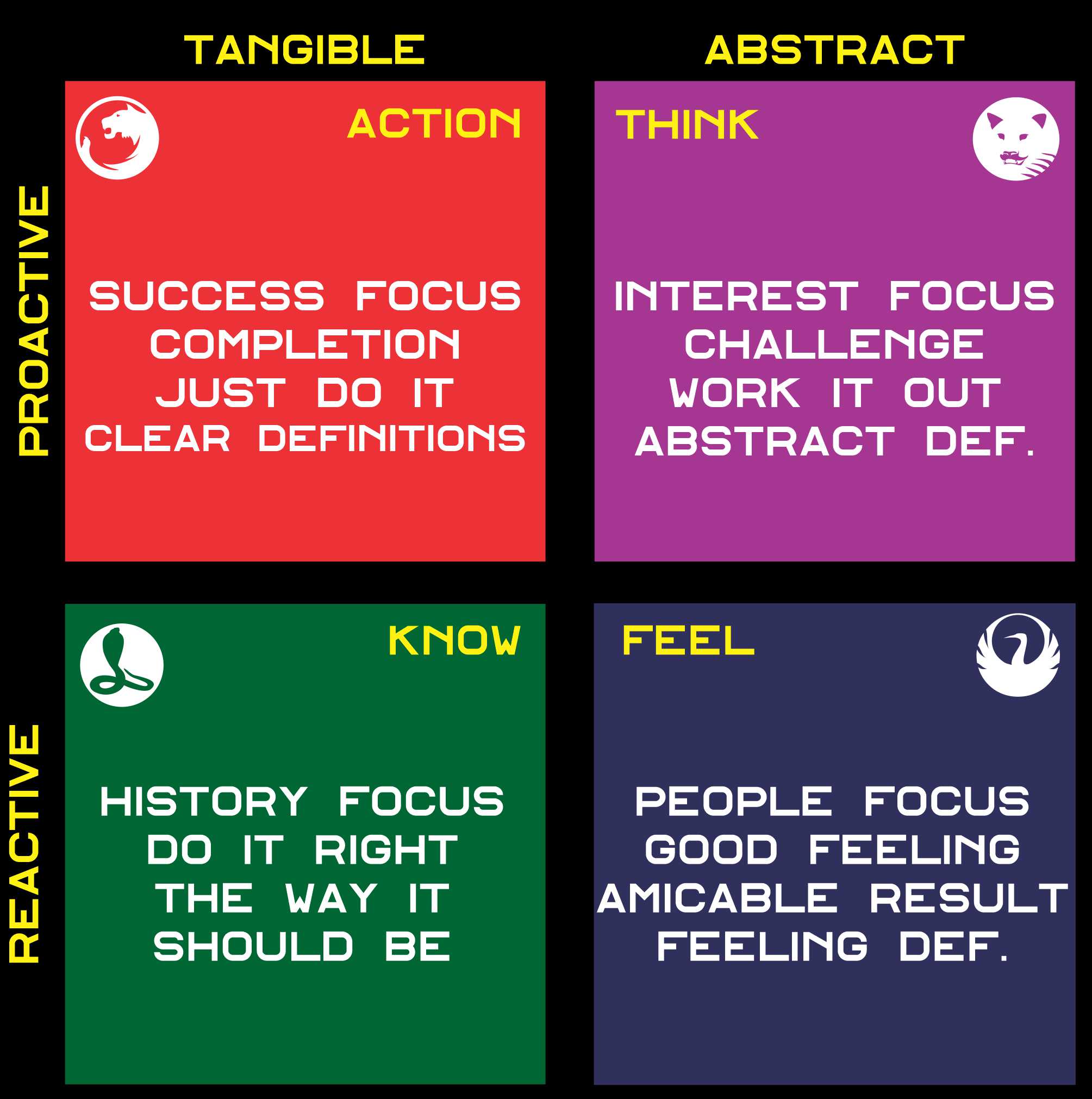 So Tigers and Snakes would be more Tangible consequences of Change where as Panthers and Cranes fear of loss would be less tangible. As statement like 'what are your really loosing' would be much more difficult for a Crane and Panther to answer where as the Tiger and Snake could most likely tell you exactly what the cost will be.